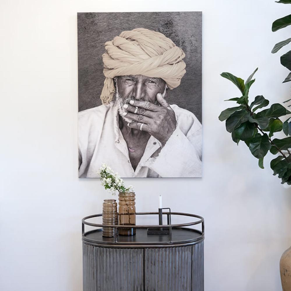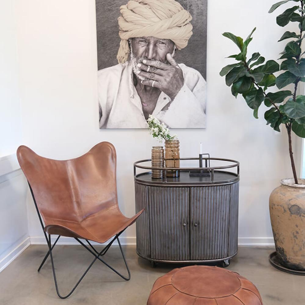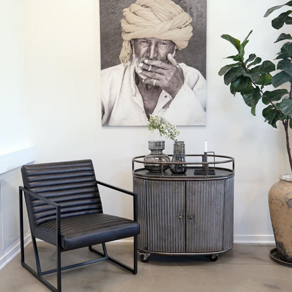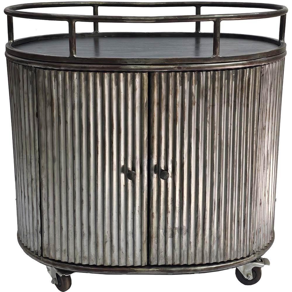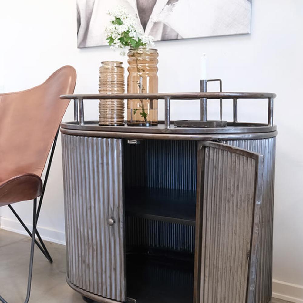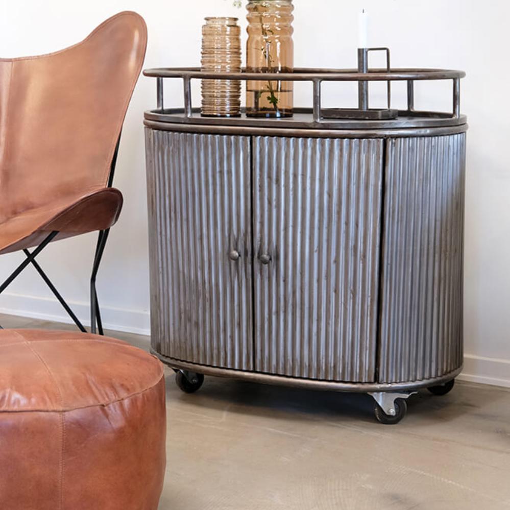 This practical and raw bar cart is made of corrugated metal with a rustic finish, adding edge and character to any space. The oval shape gives it a cool look, while the four sturdy wheels make it easy to move around—perfect for serving or as a decorative storage solution. It has a tabletop ideal for showcasing glasses and bottles. Behind the cabinet doors there are spacious shelves for storage, and this bar cart combines functionality and design. The built-in edge around the top ensures your items stay securely in place. An ideal solution for restaurants, cafés, or home bars where flexibility and style are key. Ready to roll into your décor!