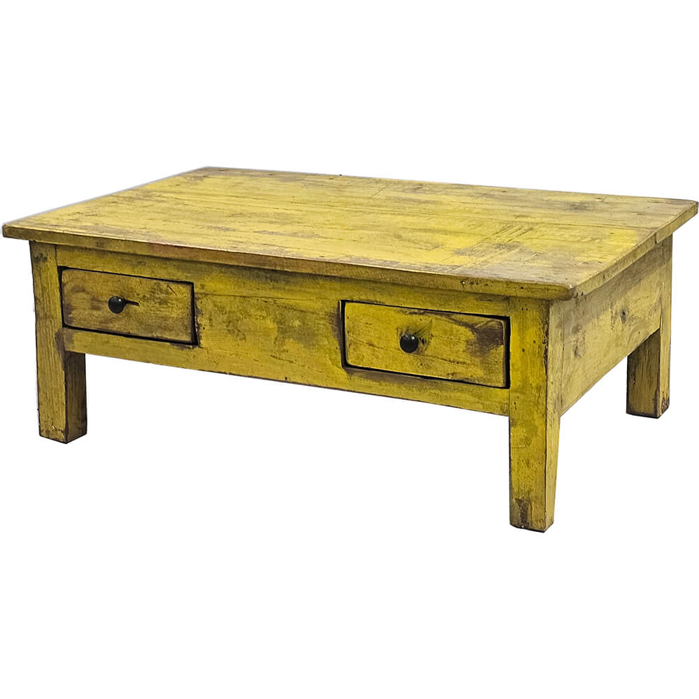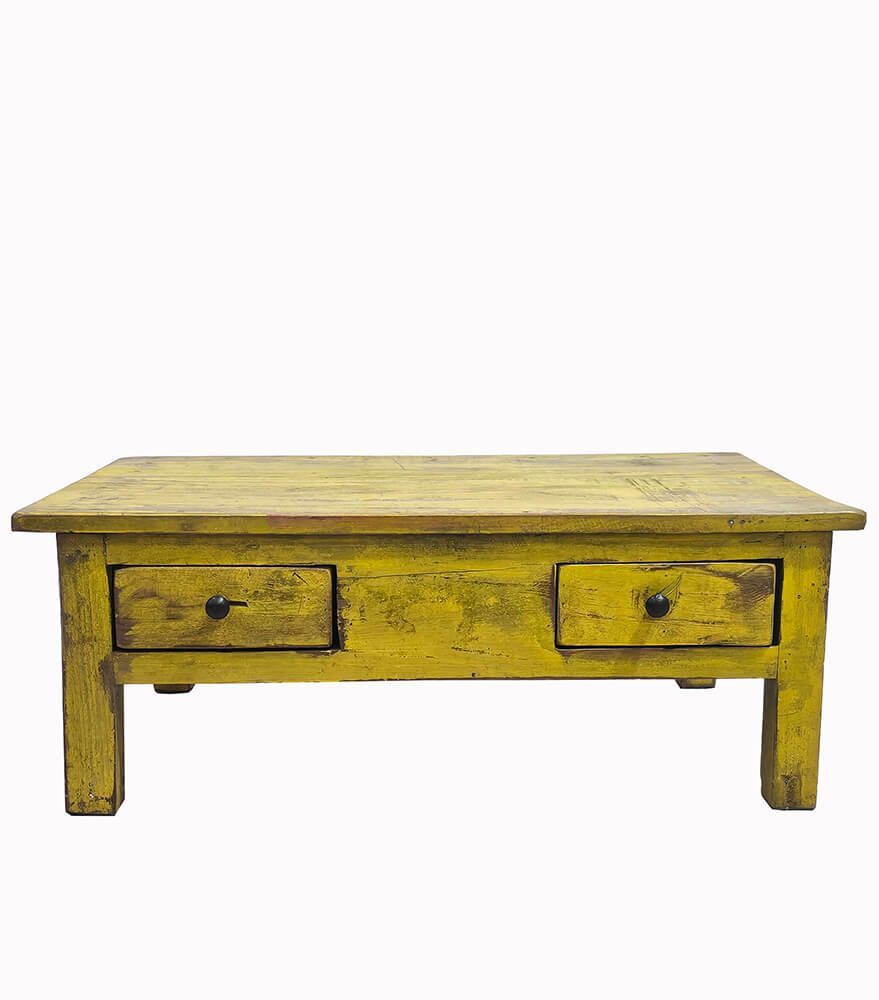 This old yellow coffee table has a warm and characterful expression, and the worn paint and the wood’s natural marks clearly tell the story of many years of use. The yellow colour is uneven and patinated, giving the table a lively look and every mark and colour shift becomes part of the overall character. The table features two practical drawers, providing space for remote controls, magazines, or other small items you want close at hand. The simple handles underline the robust and functional design. The size makes the coffee table ideal in front of a sofa, but it can also be used as a low side table or as a bench in an entrance or living room. An obvious choice for those who appreciate furniture with history, reuse, and a raw, honest expression in the interior.