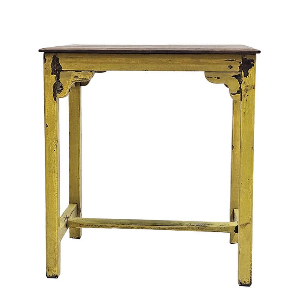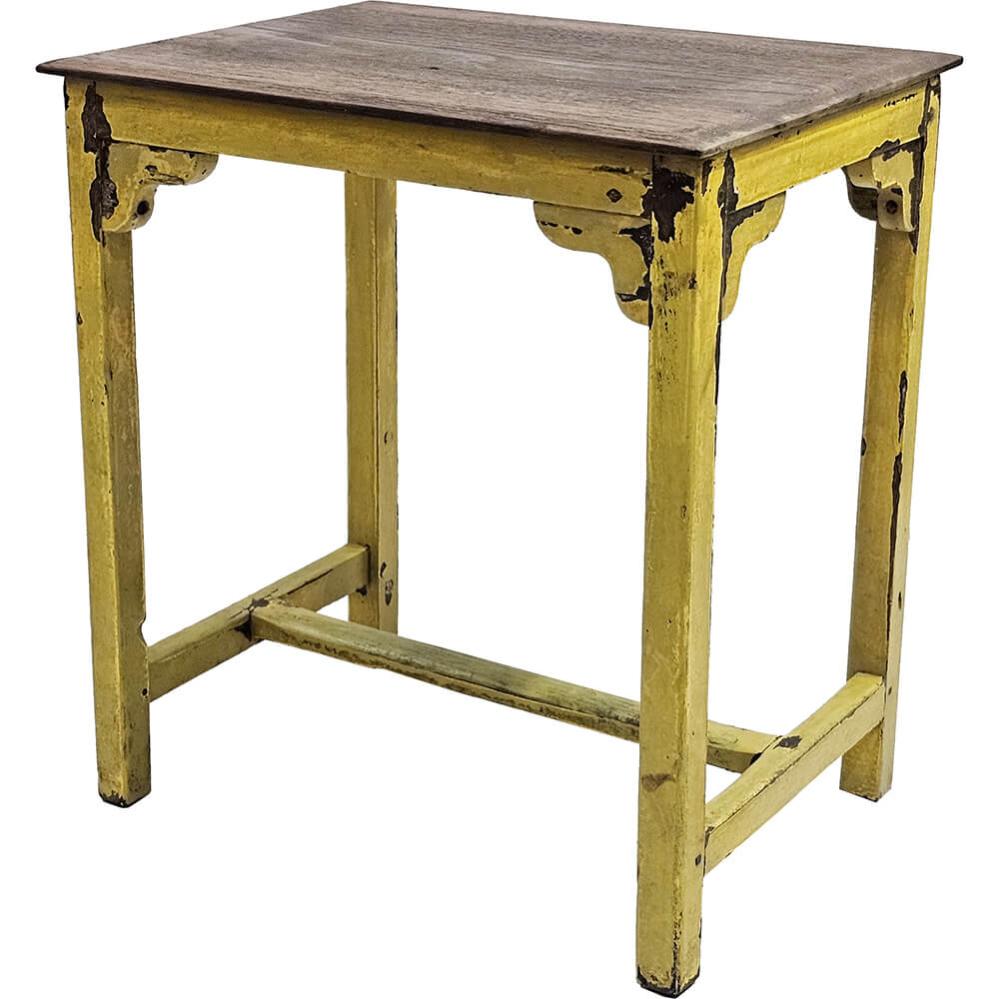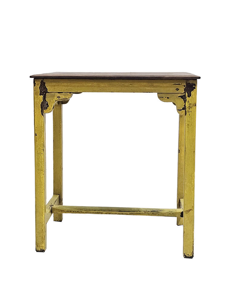 This charming little side table brings both color and personality into the room. Made of wood and painted in a beautiful worn yellow, it has an authentic vintage look full of character. The warm hue and natural patina reveal a piece with history and personalityl. Use it as a bedside table, plant stand, or as a cozy accent in the living room, hallway, or café interior. The simple construction with lovely carved details beneath the tabletop adds a touch of craftsmanship that fits perfectly in both rustic and bohemian-inspired settings. A unique piece that adds charm and a hint of sunshine to your décor.