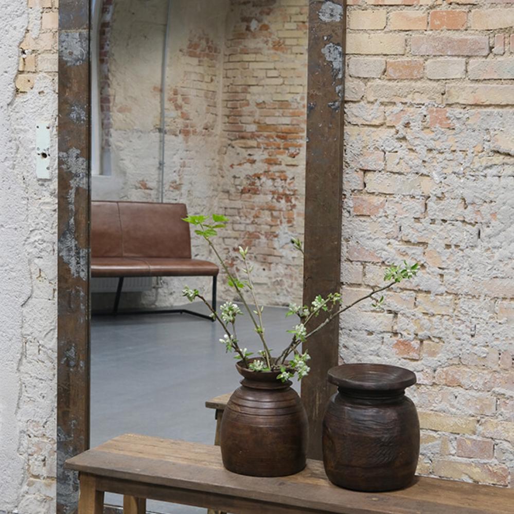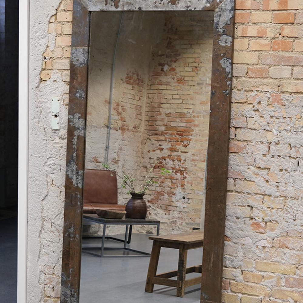 Raw full length mirror with a wide iron frame with a rustic patina. This large mirror can be used in any room - in the bedroom, entrance hall or near the wardrobe. A really nice mirror that will give your interior an industrial touch. The iron frame measures 11 cm in width.