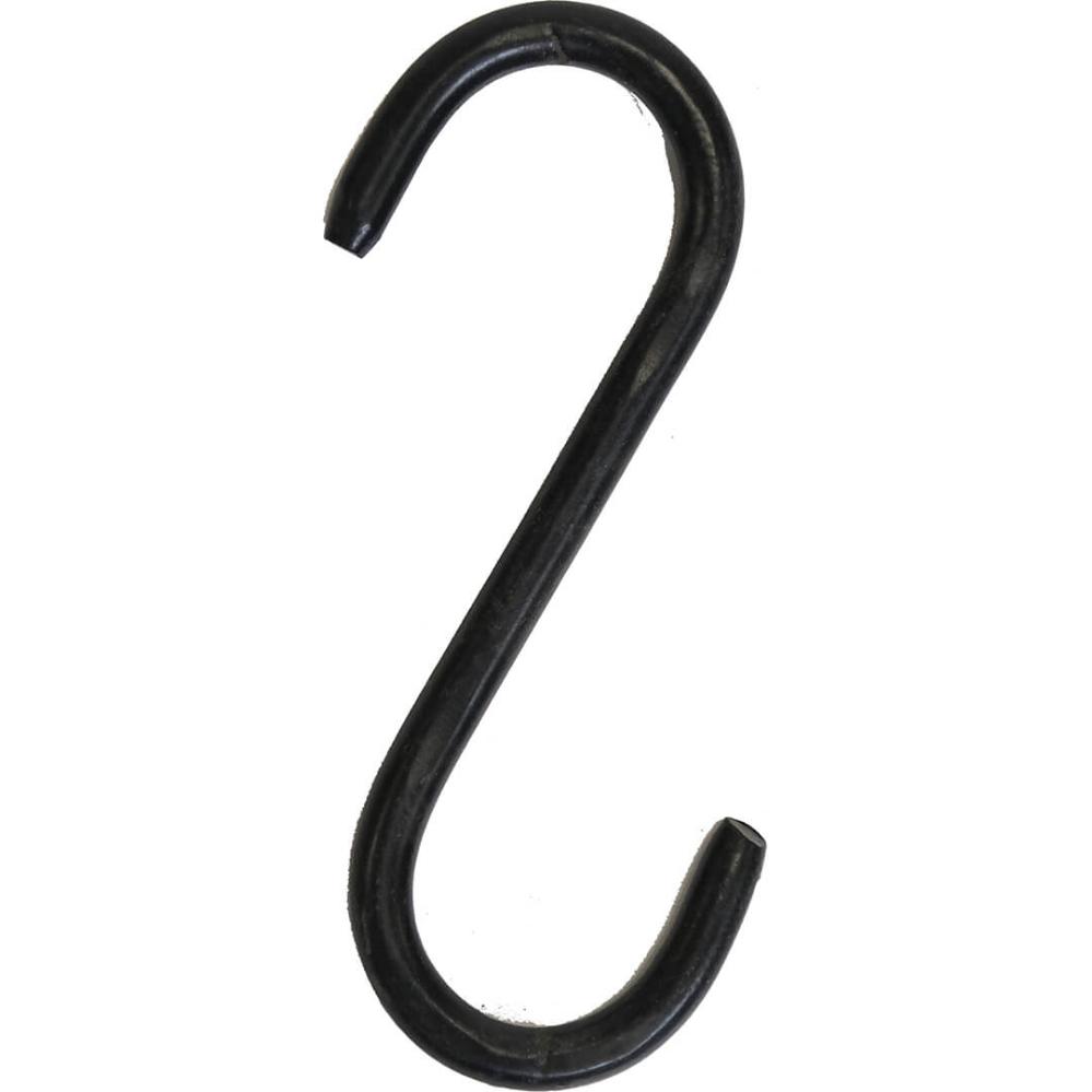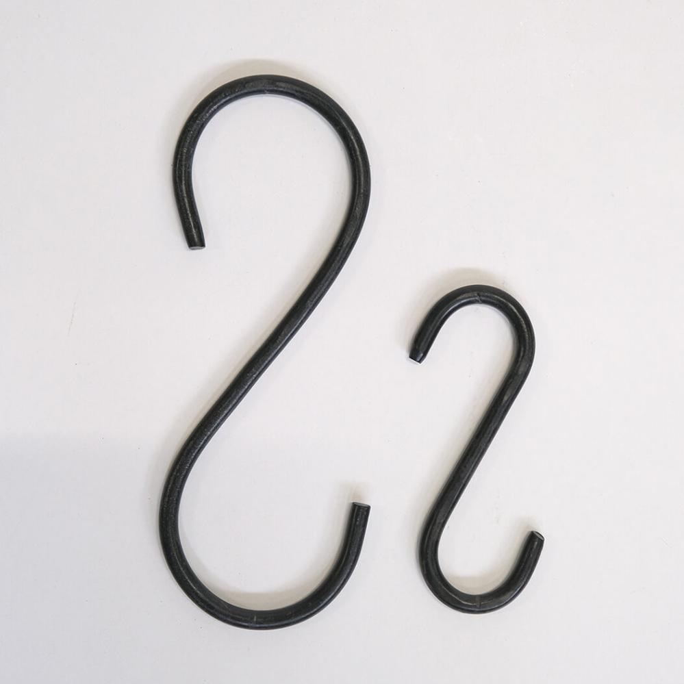 S hook in black painted iron. This hook has many uses. You can use the hook anywhere in your decor. In the bathroom for towels, in the hallway for jackets and bags, in the kitchen for tea towels and utensils, in your walk-in closet for belts and accessories or for something completely different. A multifunctional product. It is available in both large and small.