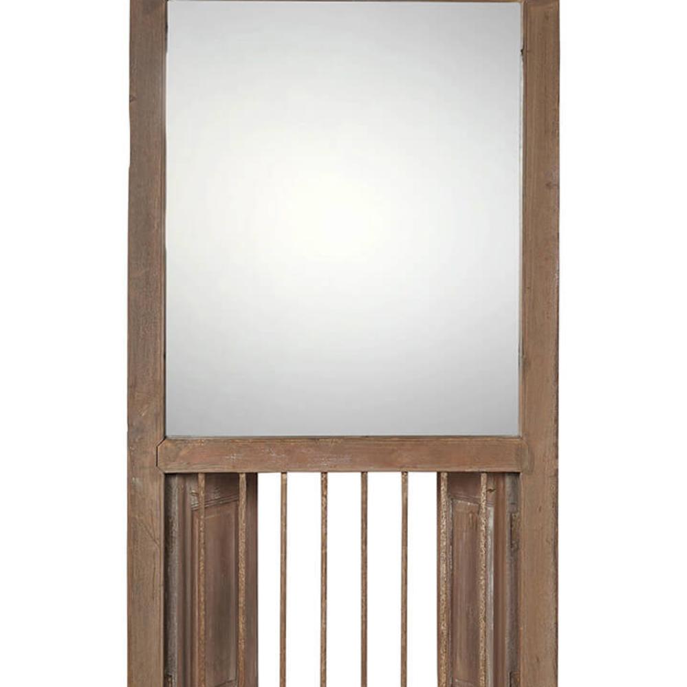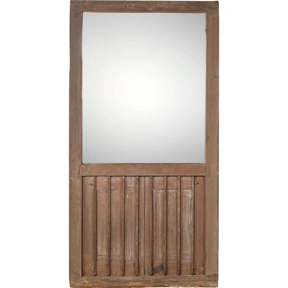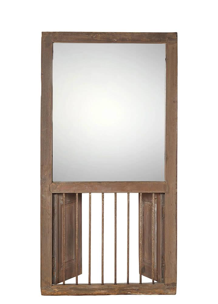 This unique mirror frame is crafted from an authentic old Indian door, exuding history and raw charm. The solid wooden construction features a beautiful patina and visible signs of previous use, giving the mirror a truly distinctive character. The mirror is mounted in the upper part of the door, while the lower part showcases the original details and carvings, reflecting the craftsmanship's origin. Perfect as a statement piece in the entryway, bedroom, or shop to add warmth and soul to the space.