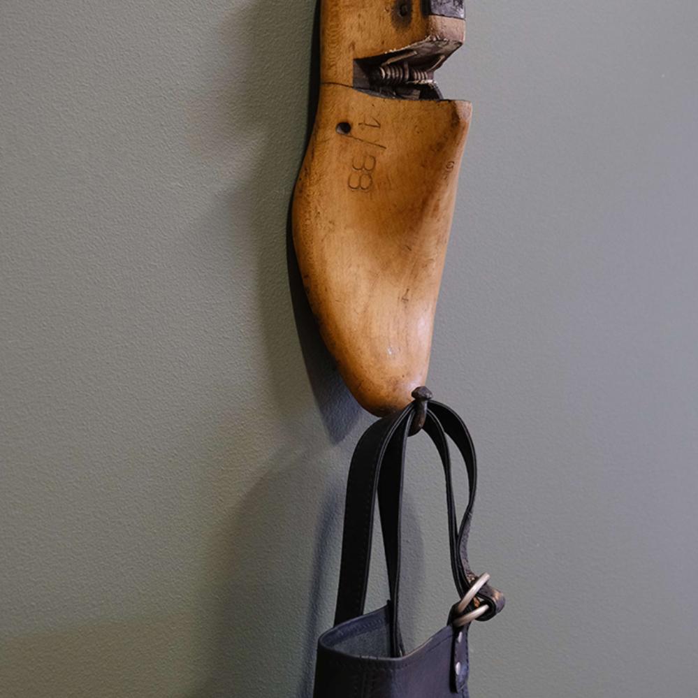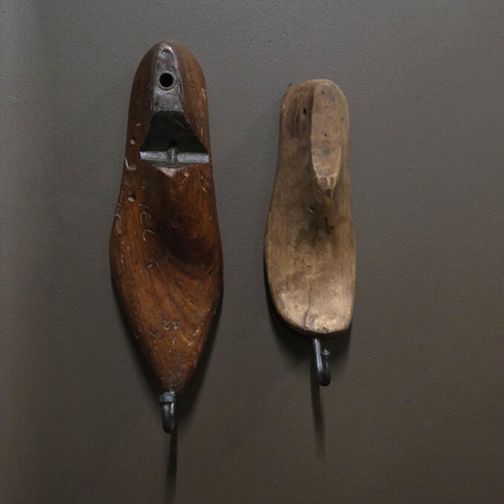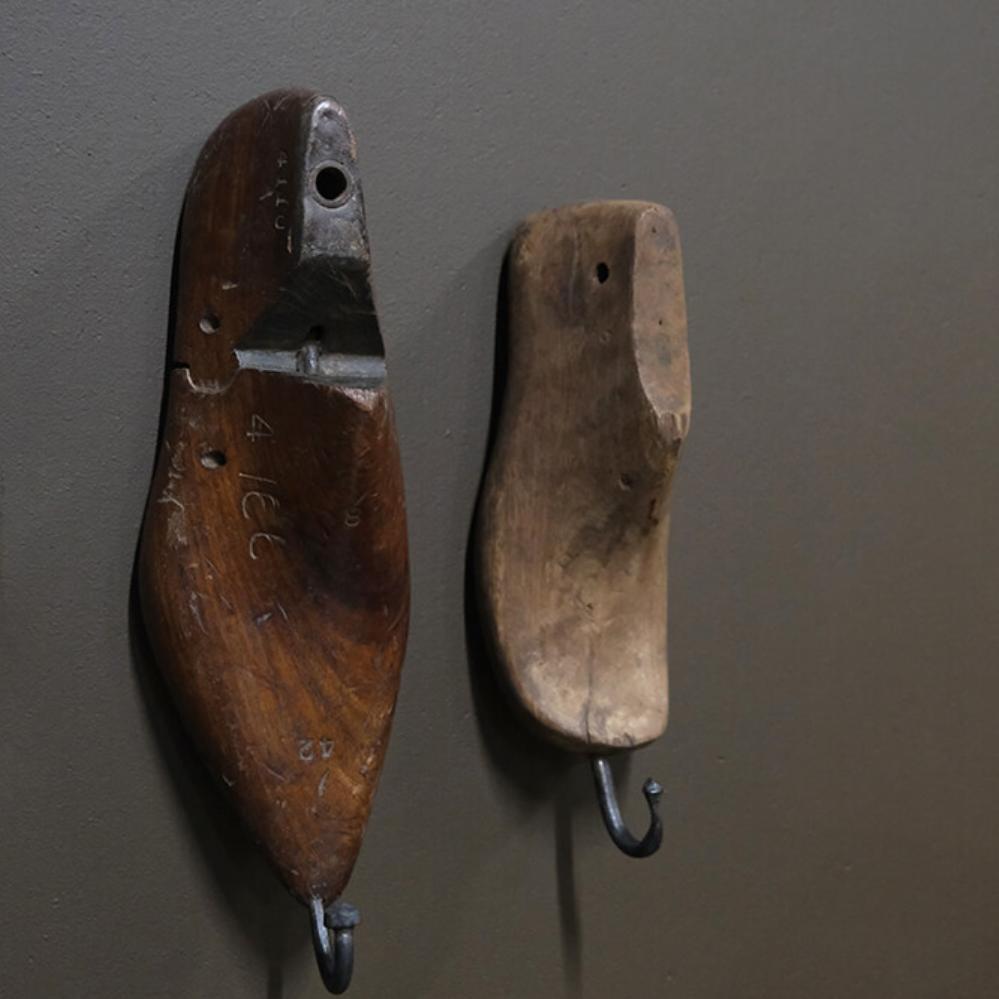 Original old wooden shoe form made into a wall hanger. The hook is suitable for hanging up scarves, jackets and accessories. These old shoe lforms were used in the past when manufactoring shoes. Nowadays, plastic forms are often used because, unlike wood, they are not affected by moisture and therefore retain their shape. The hook is the perfect choice if you are a fan of natural materials and want a natural, unique and rustic decor.