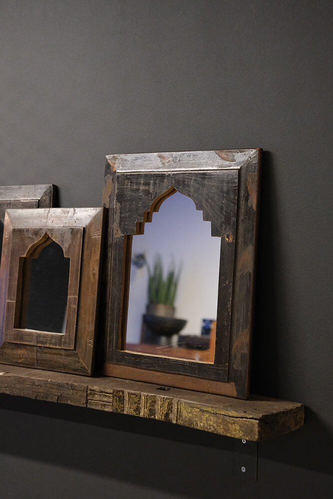 Decorative mirrors with patinated frames. The sizes, colours and shapes of the mirrors vary, giving each mirror its own expression. Some frames feature arches, some have simple carvings while others boast lovely shapes. They all share a beautiful patina on the frame. The mirrors can be mixed and matched or hung individually. Please note that these beautiful mirrors are all unique in size, colour, expression, and shape, and therefore we cannot guarantee that they will look exactly like the images.