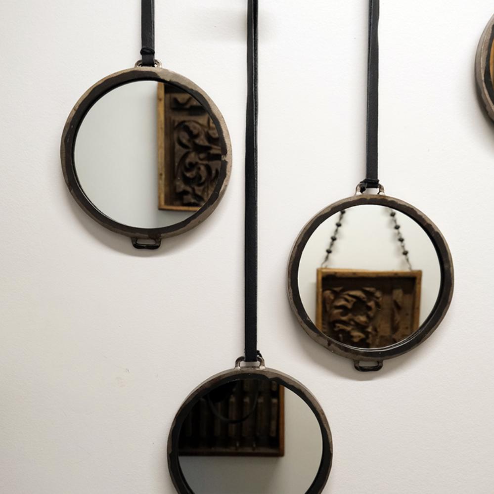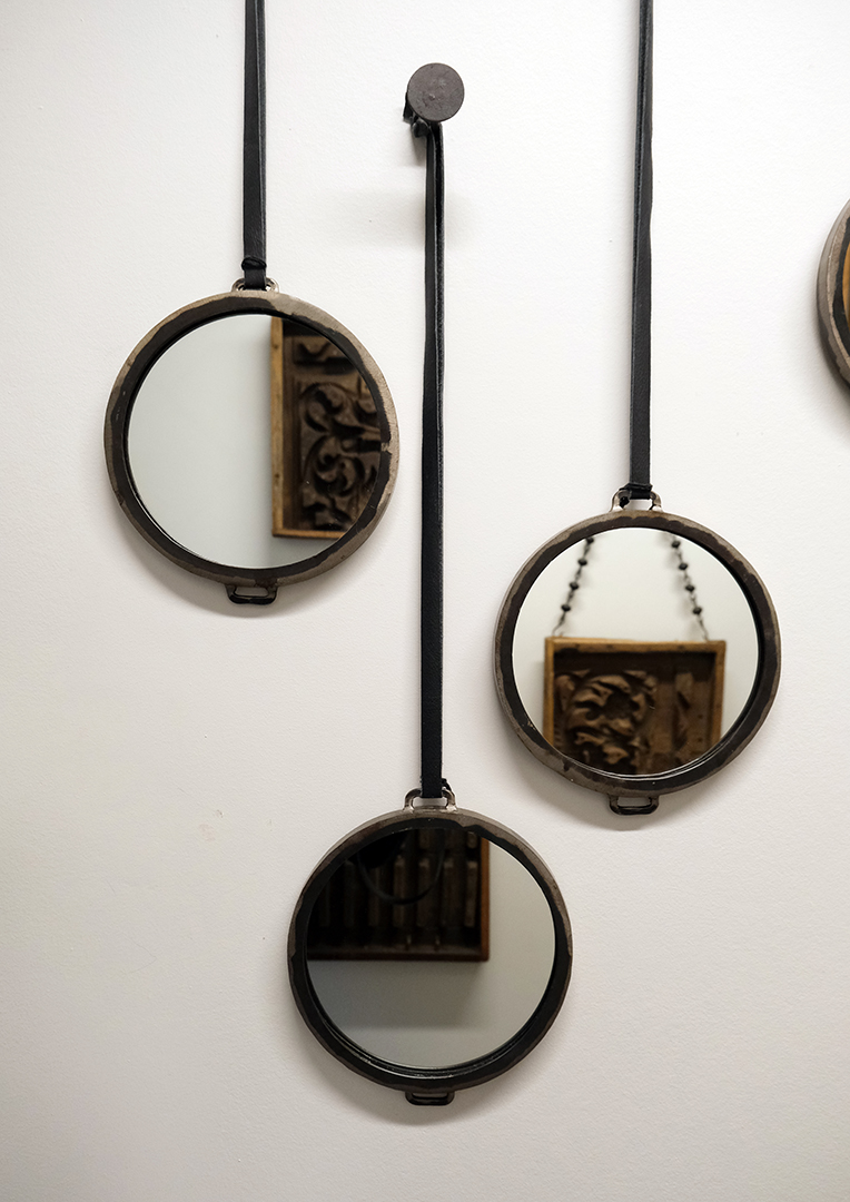 Round mirror in a raw design with leather cord for hanging. Round shapes provide a nice counterpoint to other shapes you normally decorate with.
