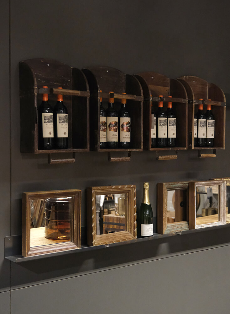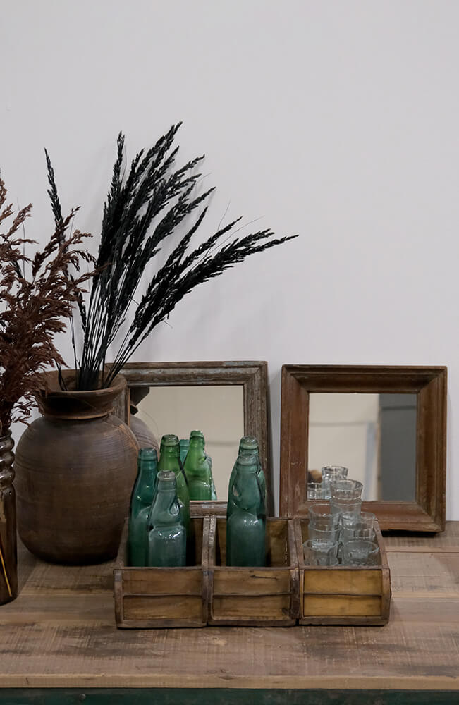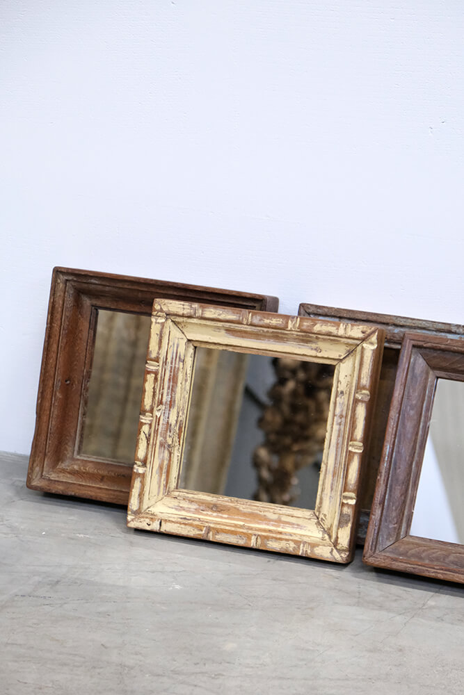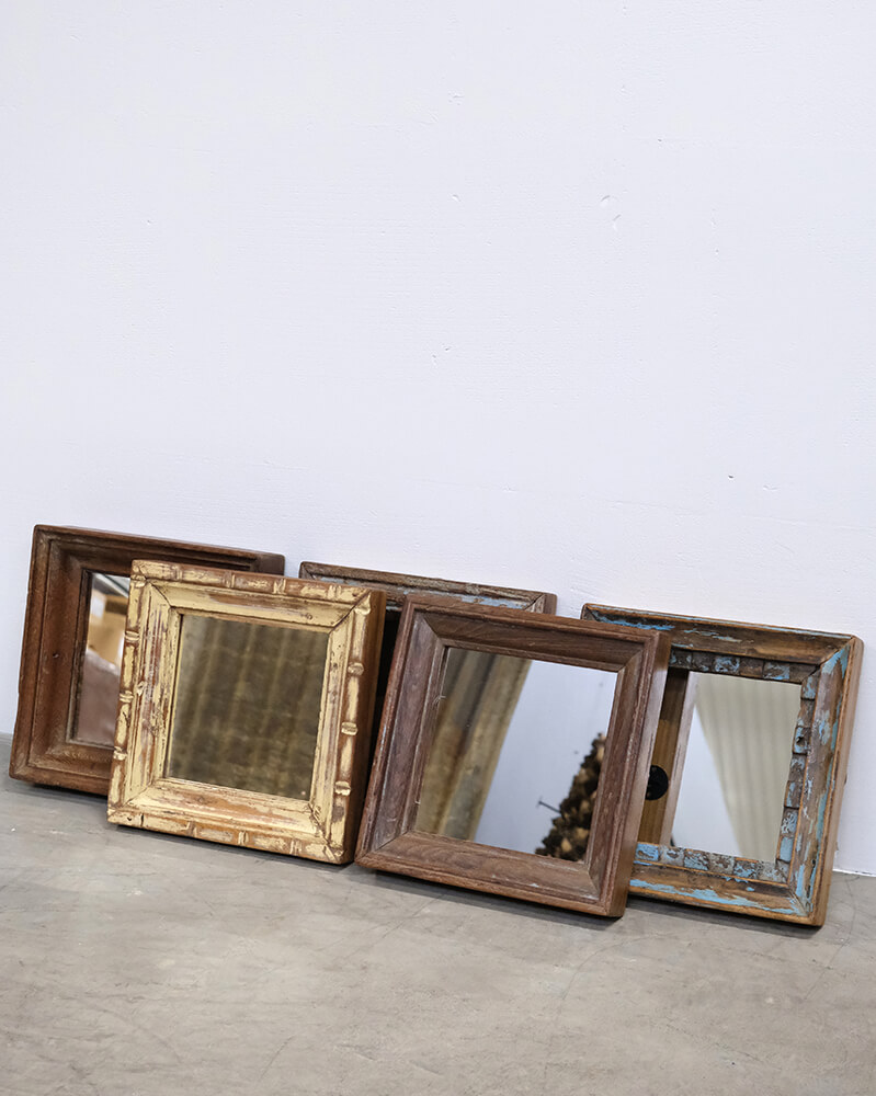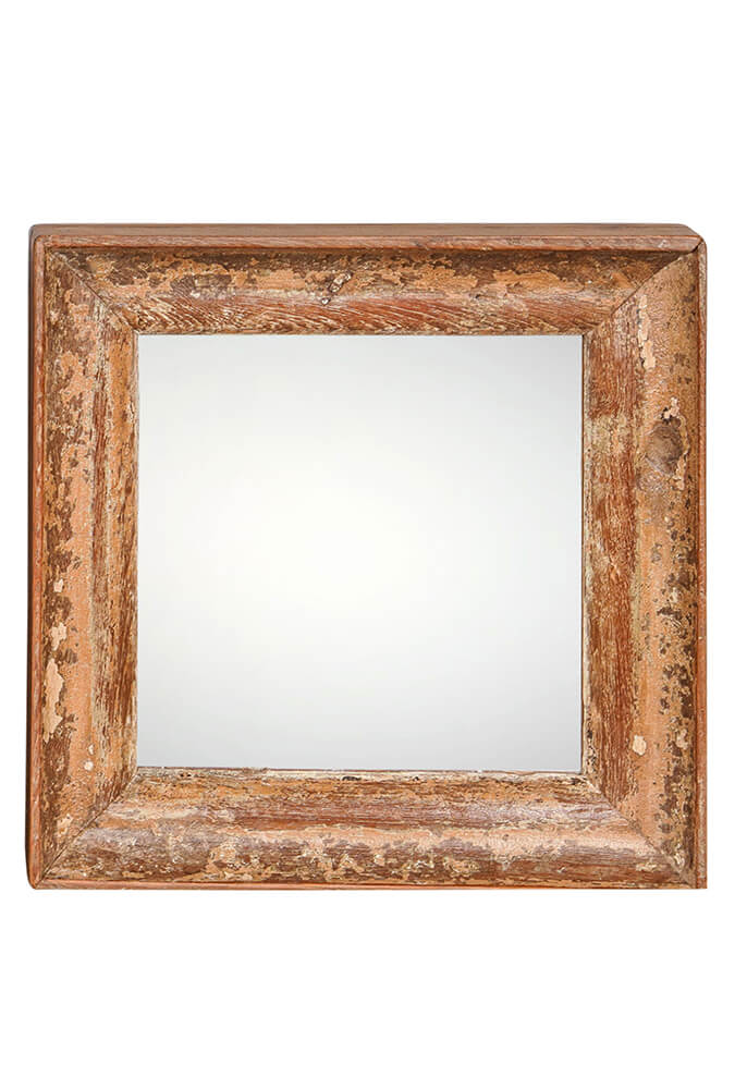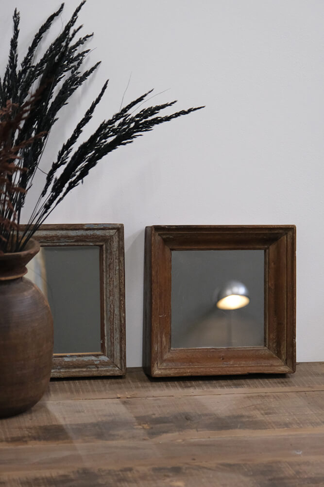 Decorative mirror with a old wooden frame where the marks of time shape its expression. The worn surface and warm wood tone add charm and personality to the interior. A mirror that reflects both light and history. Perfect for adding warmth and character to a shop, restaurant, or your home.